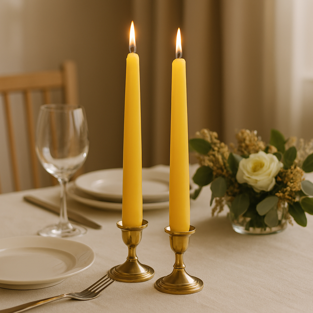 זוג נרות בצבע צהוב עז ומלא חיים, שיוסיפו חמימות ושמחה לכל שולחן או חלל בבית.