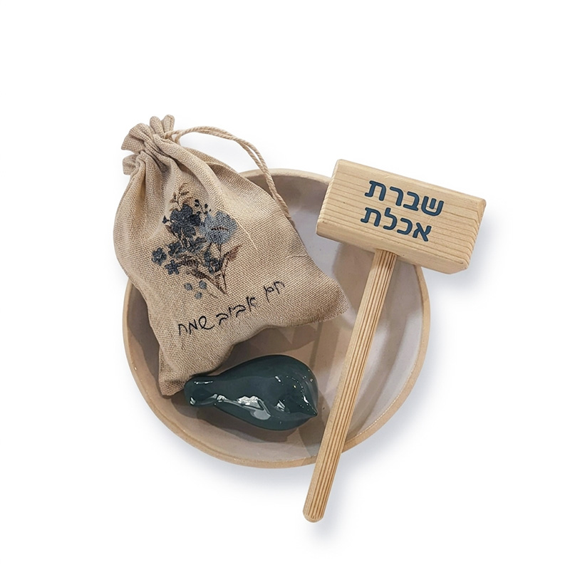 קערת סלט מקרמיקה, שקיק מעוצב במילוי אגוזי מלך, מפצח אגוזים וציפור קרמיקה