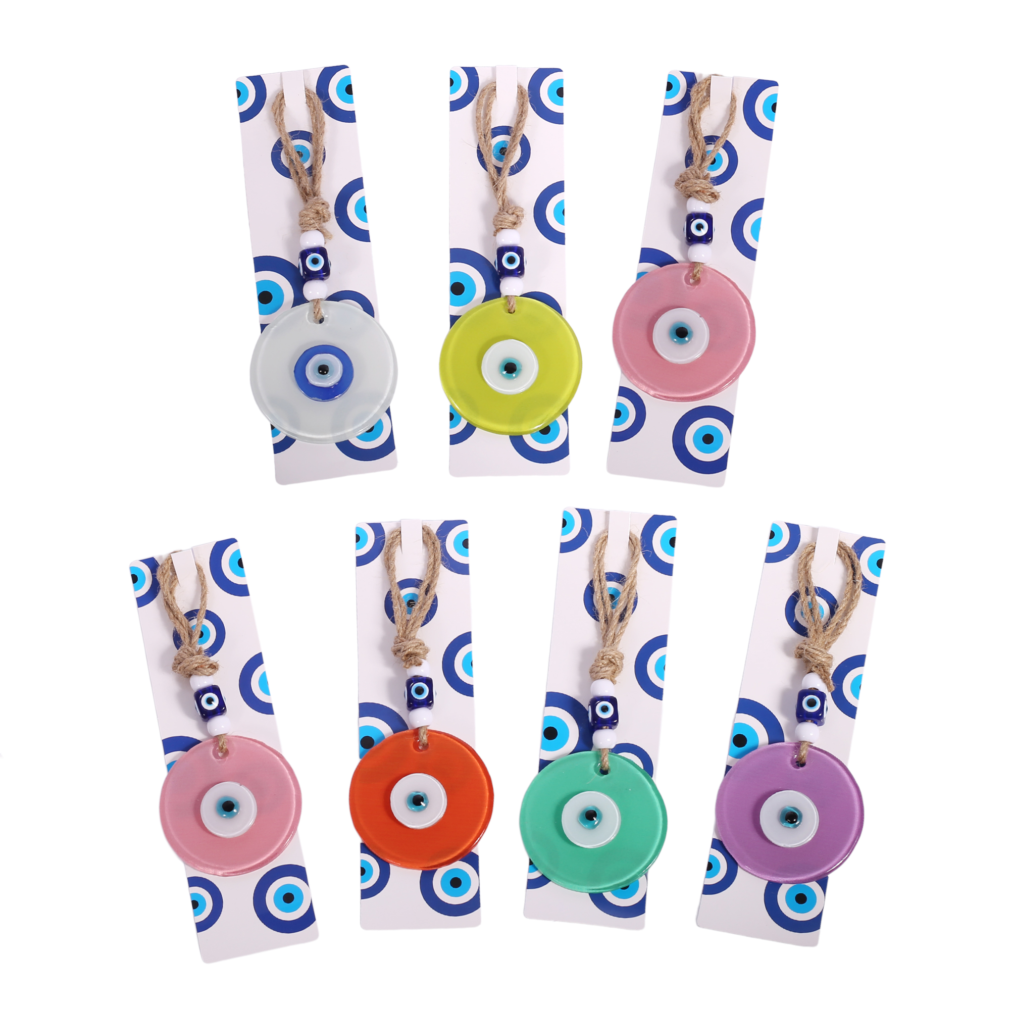 תליוני זכוכית עגולים בצבעים מרהיבים, עם עין כחולה מסורתית.